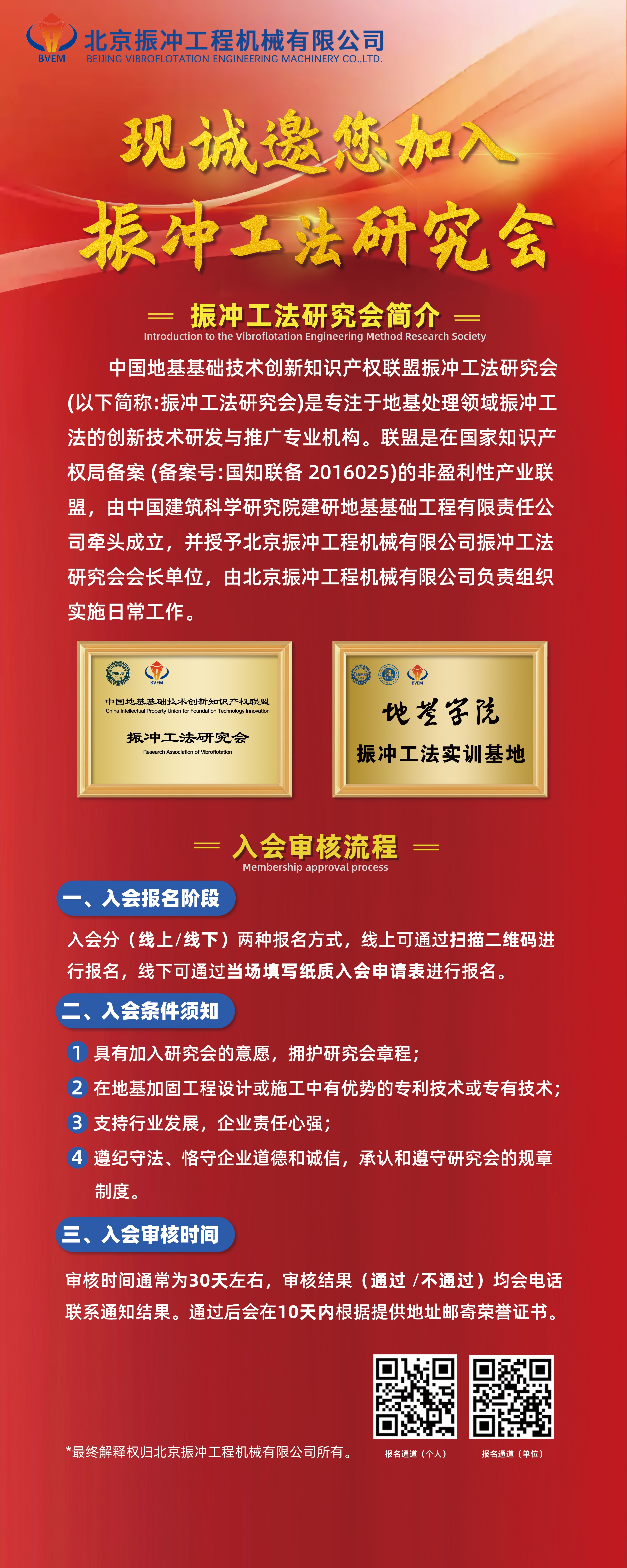 作为中国地基基础技术创新知识产权联盟副理事长单位,北京振冲机械在会议现场启动了 “振冲工法研究会”专家招募工作。该联盟是在国家知识产权局备案(备案号:国知联备 2016025)的非盈利性产业联盟,旨在搭建一个“产学研用”一体化的高水平平台,汇聚行业智慧,共同推动振冲工法的技术进步与标准化发展,此举获得了与会专家的广泛关注与积极响应。